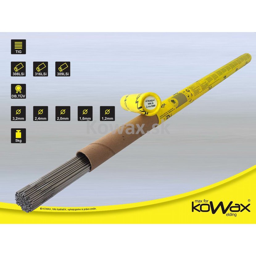 TIG zvárací drôt KOWAX s nízkym obsahom uhlíka pre zváranie nehrdzavejúcich ocelí typu 18Cr8Ni a 18Cr8Ni3Mo. Dobrá odolnosť proti bežnej korózii aj v prostredí mierne kyslých alebo s obsahom chloridov.